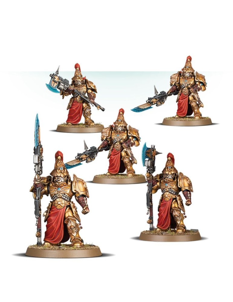 Este kit multicomponente de plástico permite montar cinco Custodian Wardens, cada uno vistiendo una túnica ceremonial que los distingue entre sus hermanos de batalla. Su armadura, adornada con águilas, relámpagos y filigranas doradas, representa la gloria del Imperio. Cada miniatura puede armarse con una lanza de guardián o un hacha de castellano, ofreciendo múltiples opciones tácticas. Los cascos, penachos y placas de armadura son intercambiables, permitiendo una personalización única para cada guerrero.
