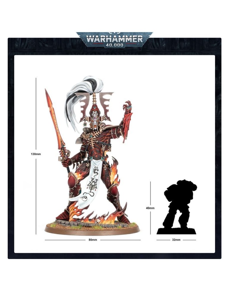 El Avatar de Khaine es la manifestación viviente de la guerra para los Aeldari, un fragmento encarnado del dios Khaela Mensha Khaine. Revestido en llamas sobrenaturales y rebosante de furia divina, atraviesa las líneas enemigas sembrando la destrucción con cada golpe de su arma, la Condenación Aullante. Su mera presencia aviva una furia ancestral en los Asuryani, inspirando coraje y despiadada agresividad en el campo de batalla.