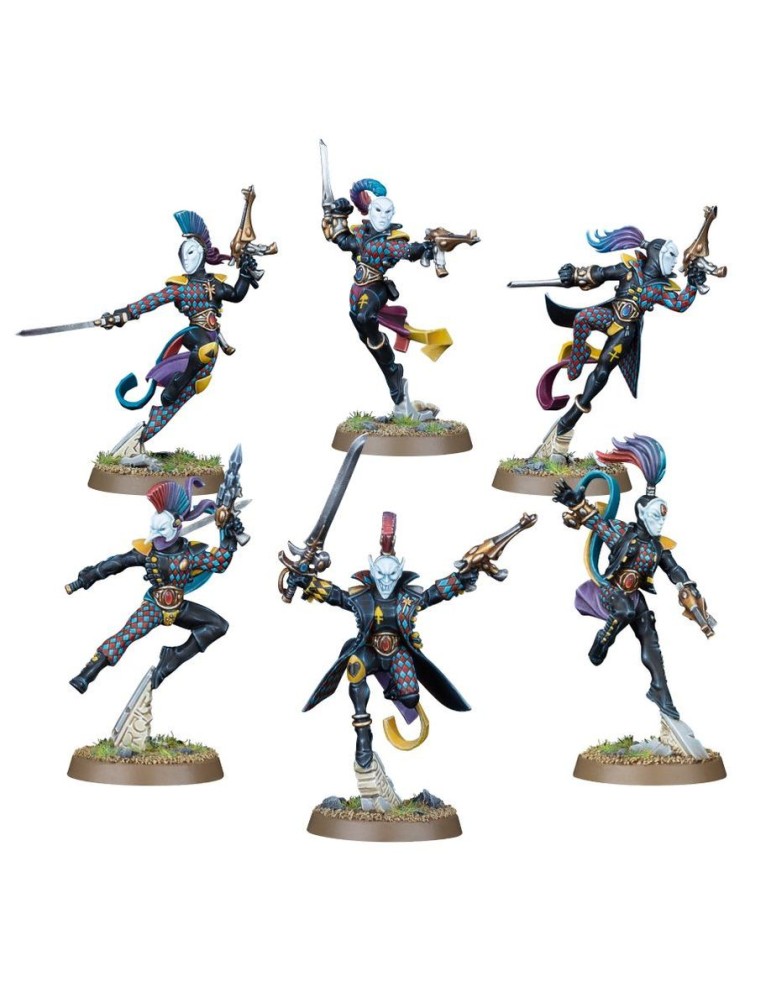 Seis Arlequines Aeldari listos para el combate acrobático: veloces, letales y con múltiples opciones de personalización para tus ejércitos de Warhammer 40,000.