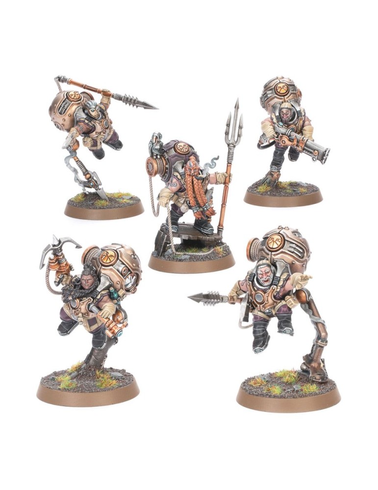 Los Arponeros Vongrim son veteranos cazadores de monstruos con endrinmochilas ligeras y arpones letales. Esta caja incluye 5 miniaturas multicomponente altamente personalizables para tus Kharadron Overlords.