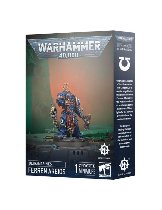 Ferren Areios, Capitán de la 6.ª Compañía de los Ultramarines, es un guerrero templado en los incendios de la Cruzada Indomitus y uno de los campeones más destacados del Imperium. Conocido como el Señor de los Rituales, fue elegido por el propio Guilliman para guiar a sus hermanos en los momentos más oscuros, preservando la tradición, la fe y el orden en nombre de Ultramar. Allí donde blande su martillo de trueno, Honor, el deber se cumple y los enemigos del Imperium caen sin remedio.