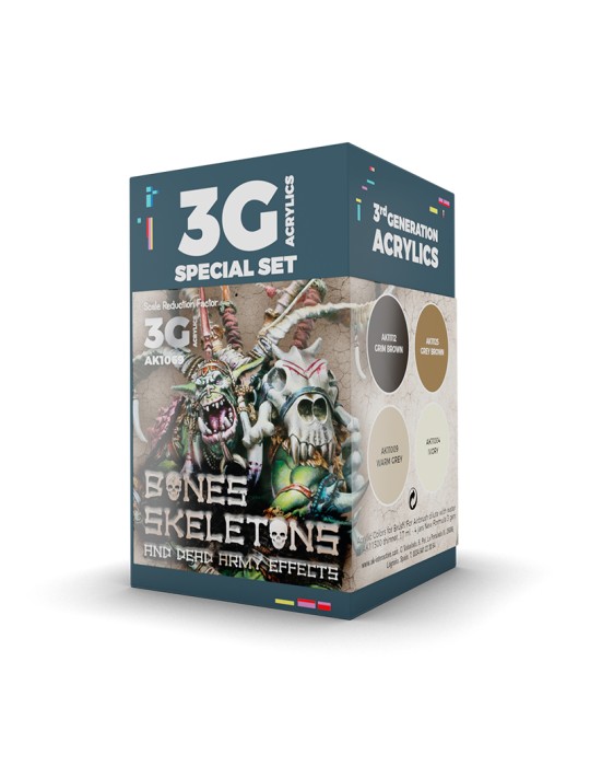 El Wargame Color Set: Bones and Skeletons de AK Interactive está pensado para conseguir tonos de hueso naturales y realistas en tus miniaturas. Este set incluye cuatro colores acrílicos 3Gen seleccionados para trabajar transiciones suaves, luces cálidas y sombras sutiles en esqueletos, cráneos o elementos óseos de cualquier figura o escenografía.